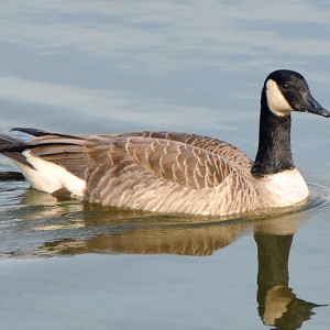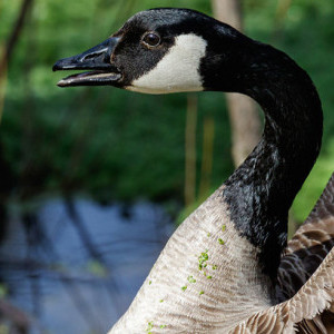 A Canadian goose is a large light-brown bird (weighing between 4.5-5.5kg) with a white chinstrap, and black head, neck, bill, legs, and feet. They present a risk to human safety in the form of airstrikes with planes; and they can be aggressive towards other birds, leading to displacement and mortality.